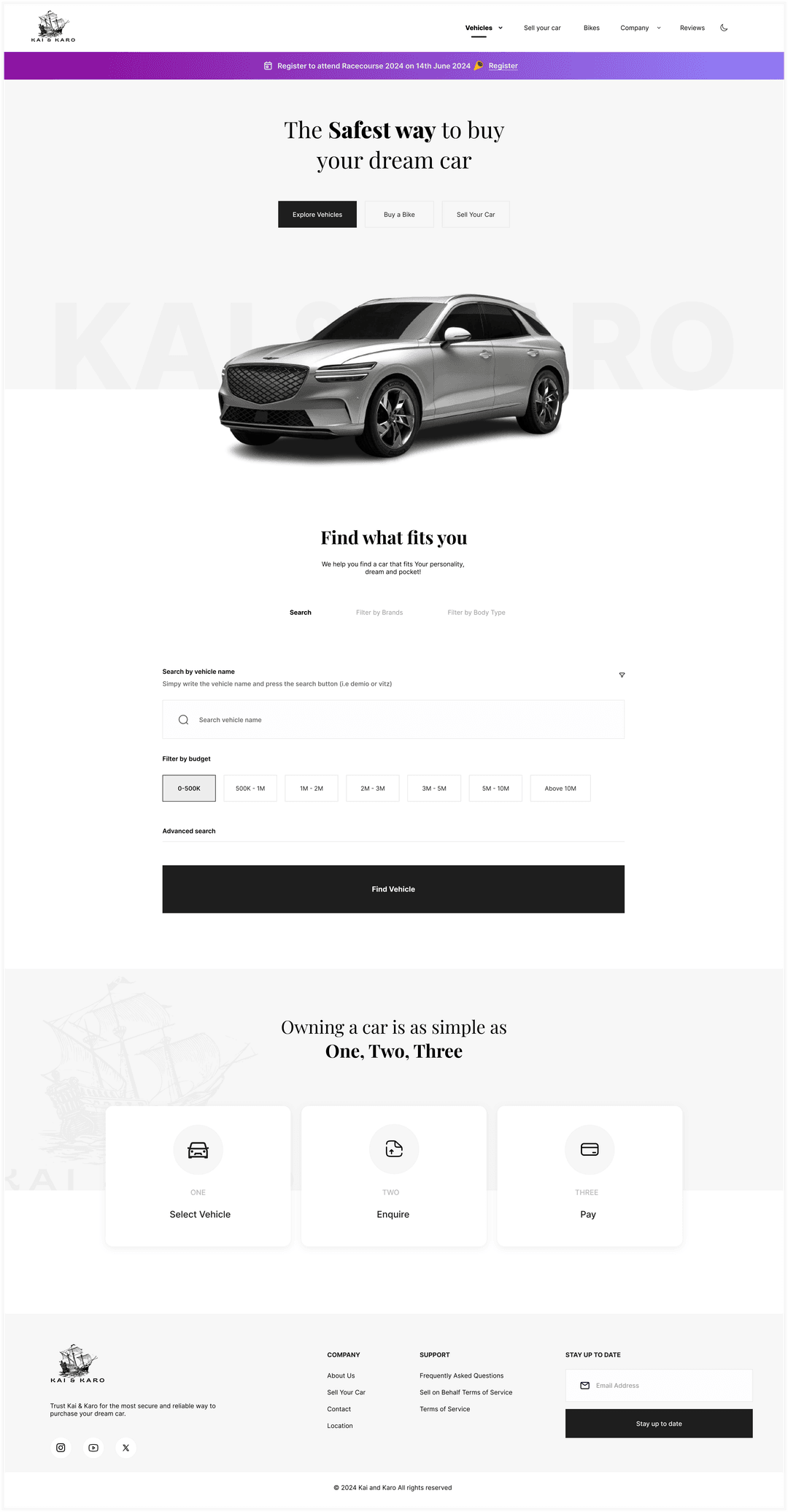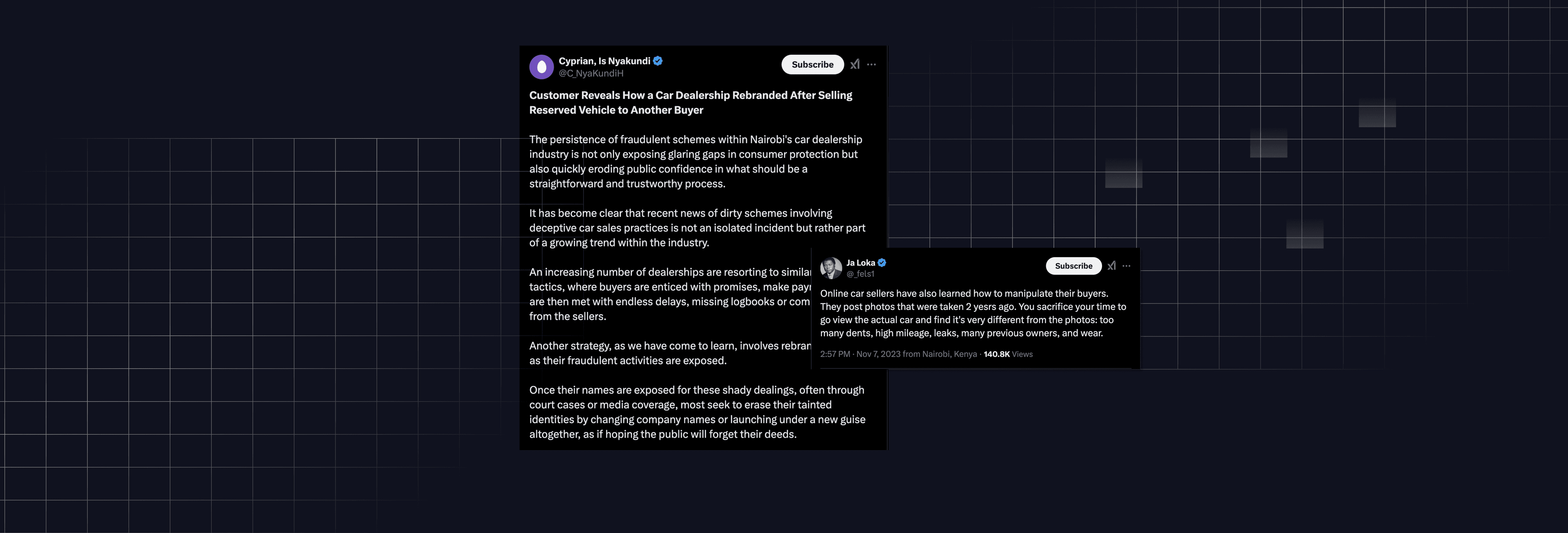 After five years in operation, Imports by Kairo experienced a co-founder dispute that led Khalif Kairo, one of the original founders, to start anew. Leveraging his 10,000 followers on social media, Kairo sought assistance in designing and building what he envisioned as an "intuitive and clean" car dealership platform. Combining this new platform with his operational expertise, he aimed to create the safest way for Kenyans to buy and sell cars.