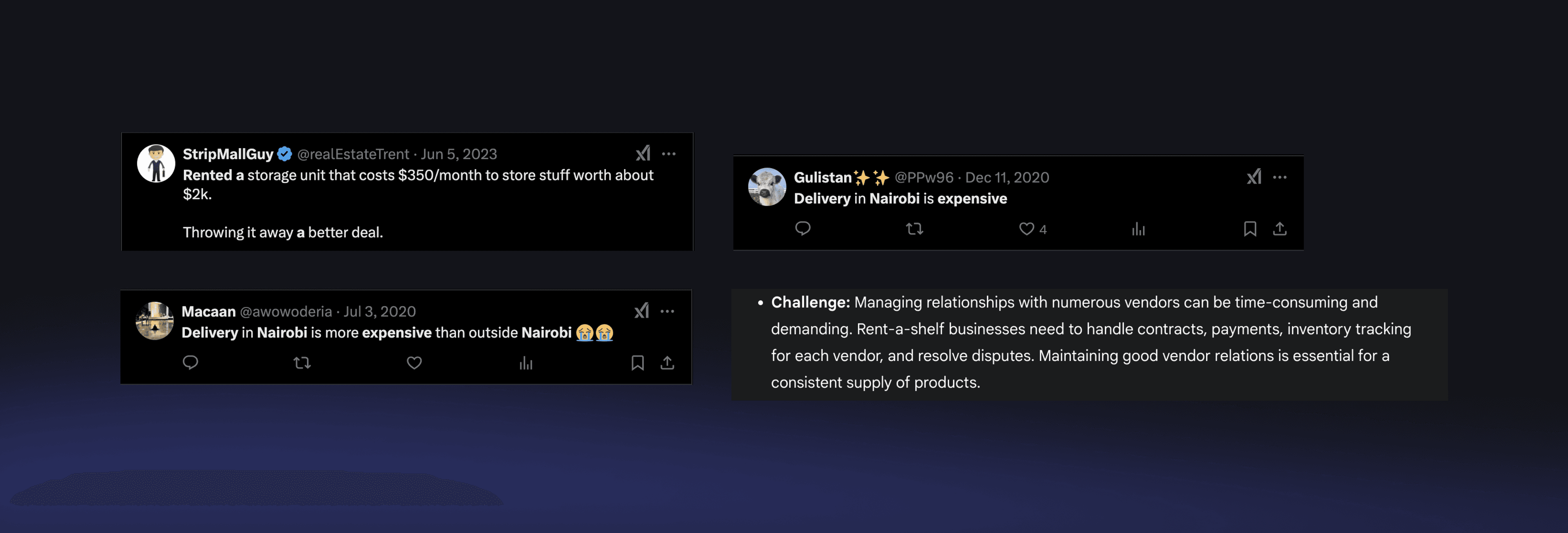 Our research pointed out the problems online sellers face, such as trust issues and high operational costs. It also revealed inefficiencies in existing rent-a-shelf models, leading to customer churn and negative reviews.