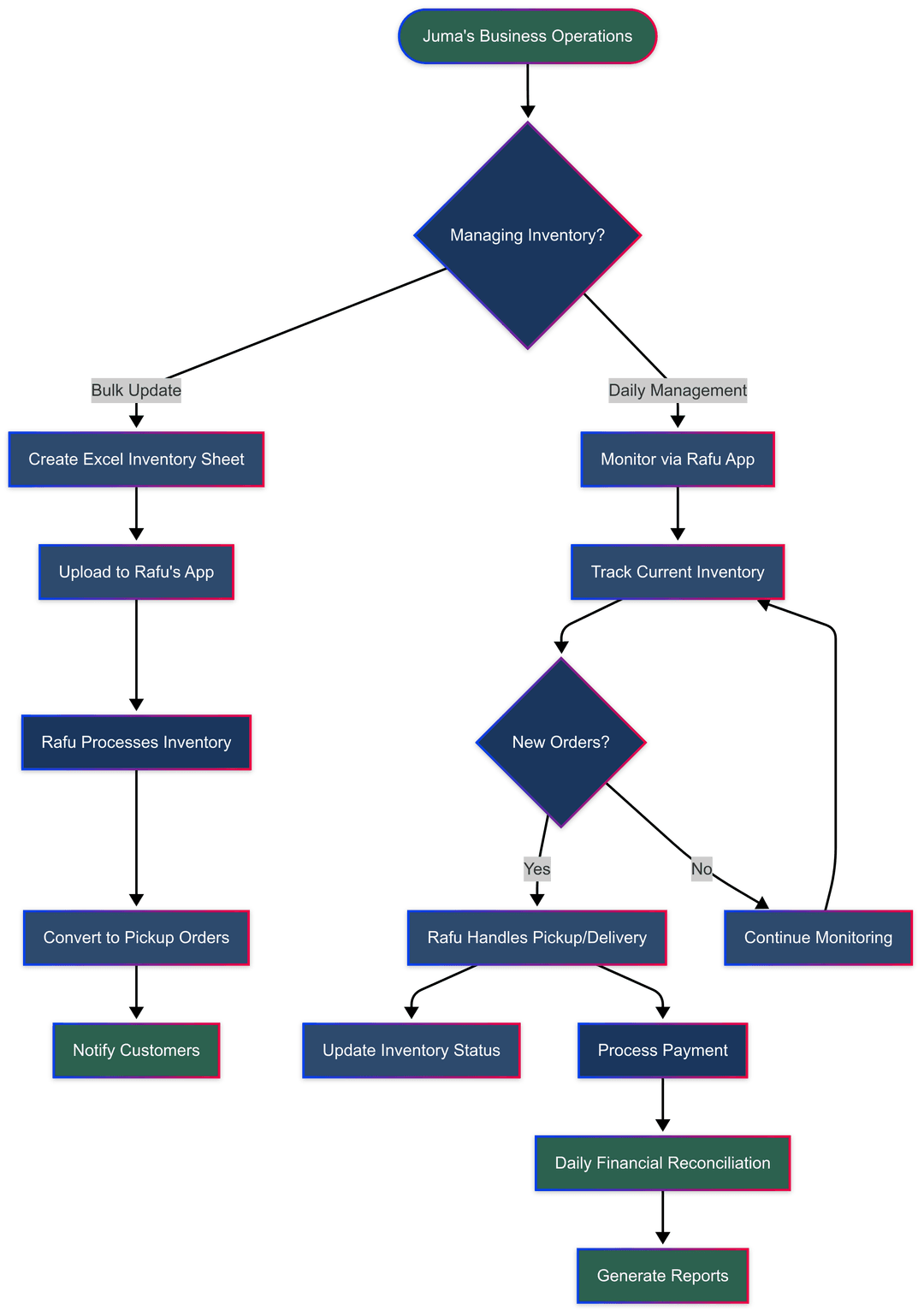 He partners with Rafu and leverages their rent-a-shelf services for storing and selling his products. Juma often travels for work, so managing his business poses a significant challenge.