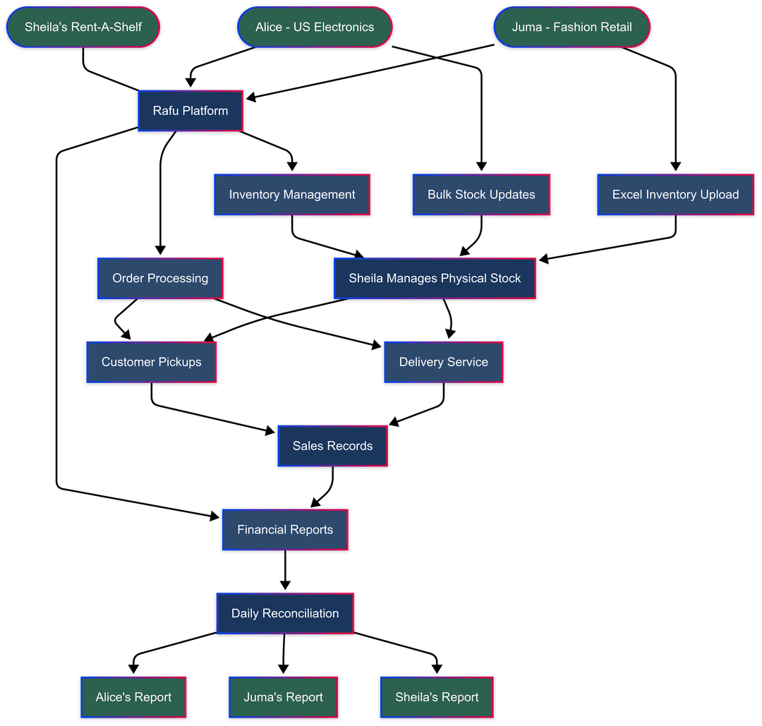 We conducted in-depth interviews with rent a shelf owners and online sellers to gather firsthand insights into their biggest pain points. This involved understanding their operational struggles, inefficiencies in inventory tracking, and challenges with customer management. By listening to their concerns, we were able to shape Rafu Zetu into a solution that directly addressed their needs.
