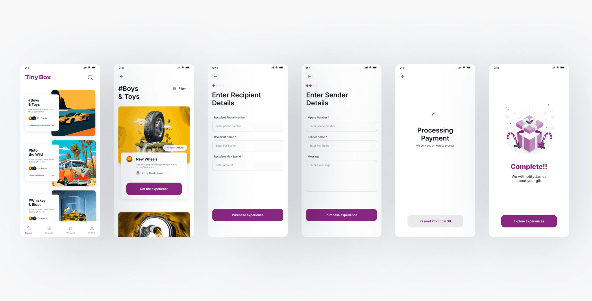 That’s how TinyBox was born. Let’s say I love cars - my girlfriend could gift me a fuel voucher, a tire replacement, or even a car service. If I’m into whiskey, she could surprise me with tickets to a whiskey tasting event or a distillery tour. The idea was to design a flow where the purchaser could explore themed experiences or browse partner brands, pick something cool, buy it, and boom, a voucher lands in the recipient’s inbox. Simple, personal, and way more thoughtful than another “best guess” present.